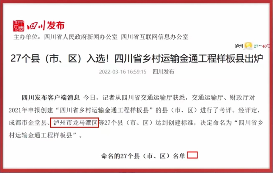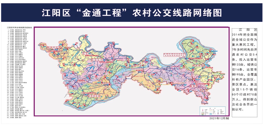 助力龍馬潭區(qū)以公交為紐帶實(shí)現(xiàn)了半小時經(jīng)濟(jì)圈,在江陽區(qū)實(shí)現(xiàn)全域公交村村通。江陽區(qū)54條農(nóng)村公交線路惠及群眾50萬人。在目前的公交線路中,全域公交、農(nóng)村公交線路占比達(dá)34%,江陽區(qū)“金通工程”全域公交先后2次在全省作經(jīng)驗交流,并獲得“四川省鄉(xiāng)村運(yùn)輸金通工程樣板縣”殊榮。