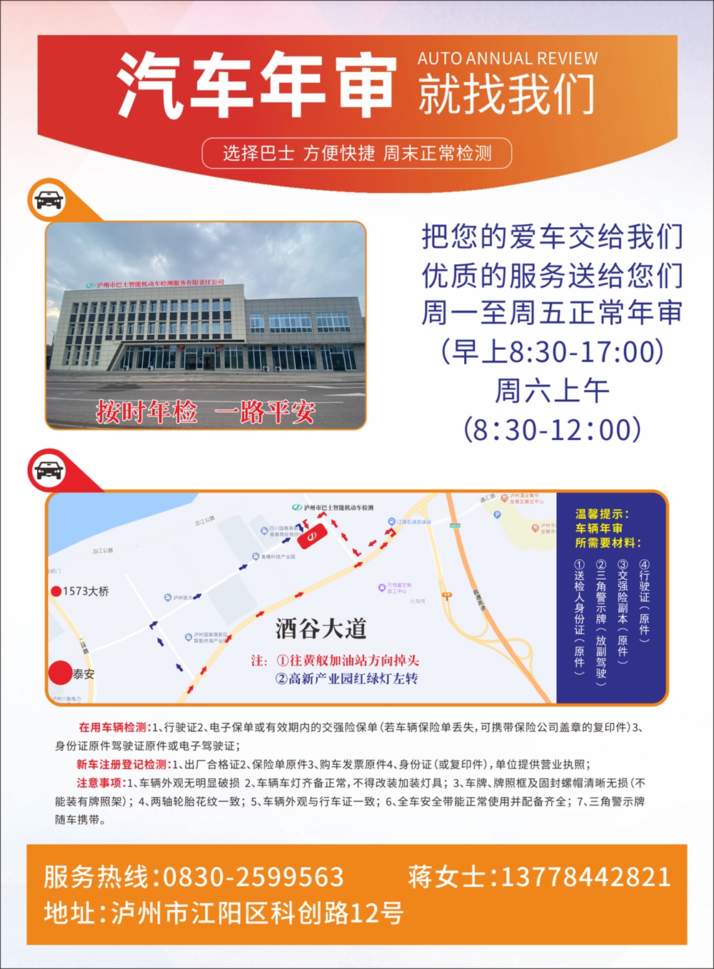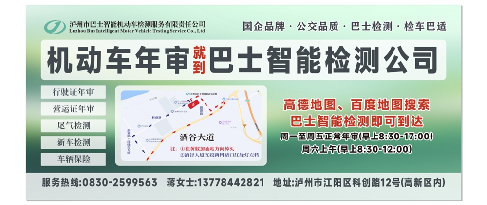 瀘州市巴士智能機(jī)動(dòng)車檢測(cè)服務(wù)有限責(zé)任公司占地面積地20余畝,是瀘州市公交集團(tuán)全資子公司,位于瀘州市江陽(yáng)區(qū)科創(chuàng)路12號(hào)(高新區(qū)內(nèi))。檢測(cè)場(chǎng)站服務(wù)項(xiàng)目齊全、設(shè)備先進(jìn)、管理規(guī)范、實(shí)力雄厚,檢測(cè)人員優(yōu)秀,技術(shù)力量精湛。本公司堅(jiān)持“公正公平、科學(xué)準(zhǔn)確、以人為本、高效服務(wù)”的宗旨,一切為客戶著想,全面為客戶提供規(guī)范檢測(cè)、誠(chéng)信服務(wù),為受檢車輛提供可靠的檢測(cè)數(shù)據(jù),為瀘州市機(jī)動(dòng)車安全運(yùn)行提供支撐和保障。
