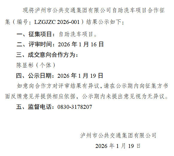 瀘州市公共交通集團(tuán)有限公司自助洗車項(xiàng)目合作征集結(jié)果公示