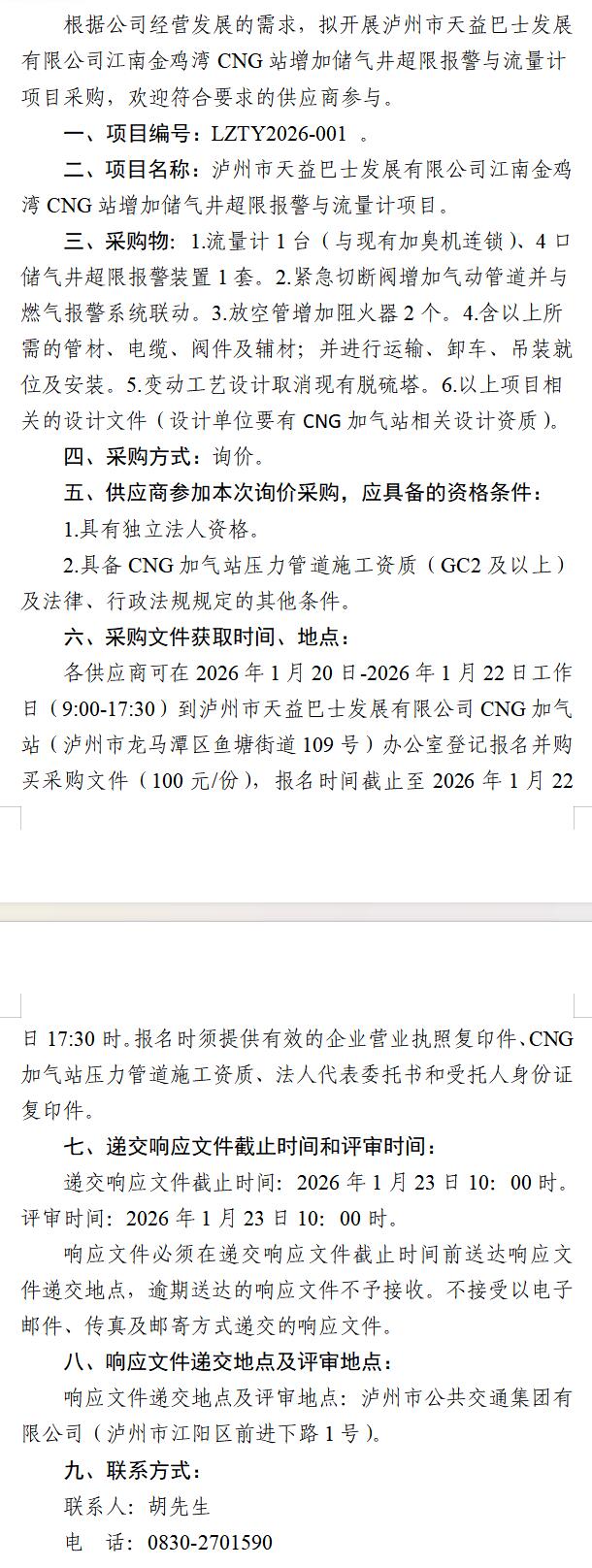瀘州市天益巴士發(fā)展有限公司江南金雞灣CNG站增加儲(chǔ)氣井超限報(bào)警與流量計(jì)項(xiàng)目采購(gòu)公告